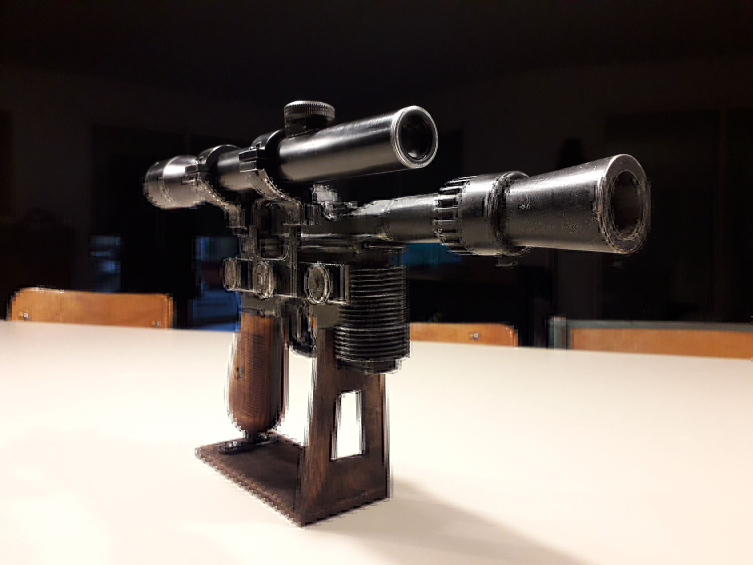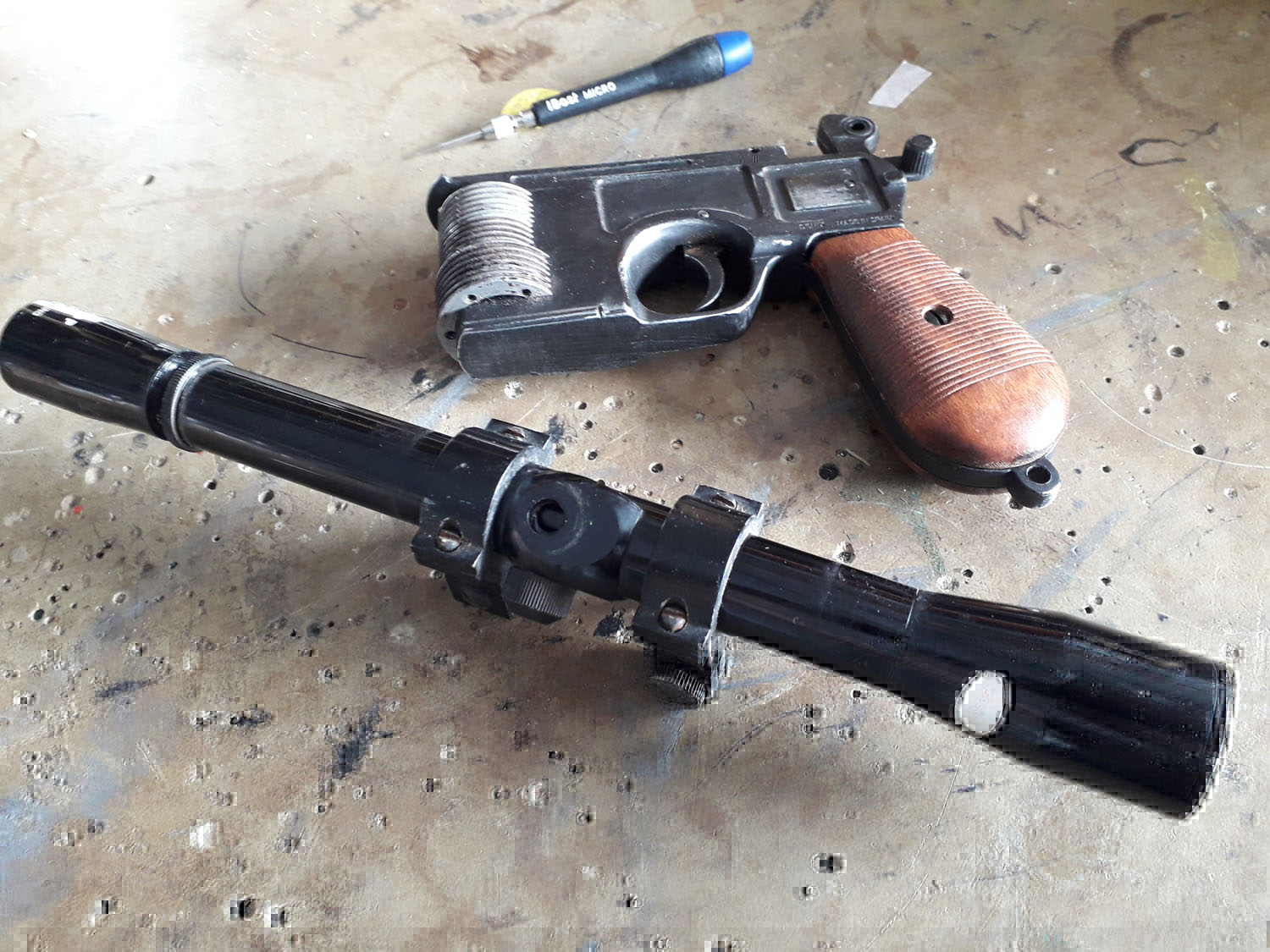 Je vous propose un Blaster réalisé dans l'esprit cosplay (du fait maison à prix raisonnable...en l’occurrence moins de 90 euros pour cette arme). Je n'ai pas cherché à faire une réplique parfaite d'un des blaster de Han solo mais plutôt quelque chose de crédible et réaliste (100% métal).