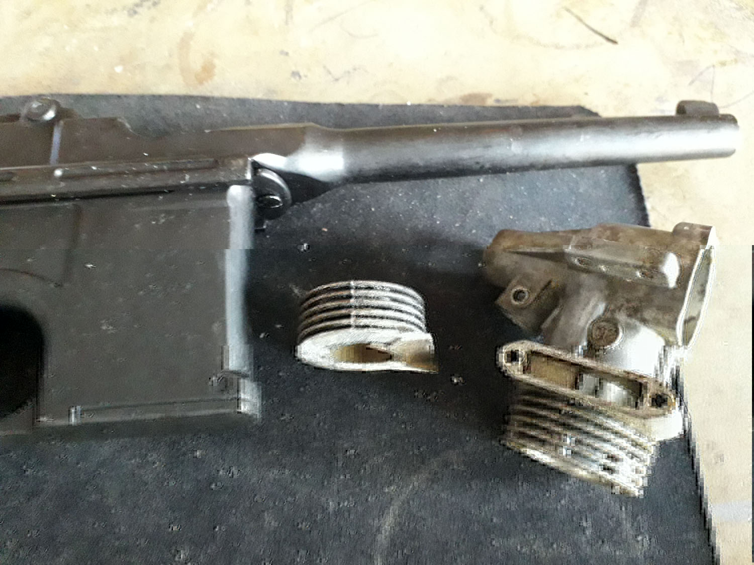 Je commence par les grilles de refroidissement sur le chargeur.Je décapite 3 moteurs thermique de modélisme HS pour récupérer les culasses et leurs ailettes.Il faut ensuite les découper pour qu'elles s'imbriquent le plus proprement possible sur le chargeur.L'ensemble sera coller à la pâte métal époxy. J'ai trouvé une lunette de tir un peu fatiguée sur le web pour 10 €. Un peu plus plus longue que l'original (mais on va couper) et diamètre un peu plus faible...mais les proportions générales sont dans les clous. Je coupe l’excédent de lolngueur de lunette au coupe tube de plombier et j'inverse le petit tube intérieur qui contient la mire d'un coté et une lentille de l'autre... pour avoir la lentille à l’extérieur (un peu compliqué à expliquer). Je démonte les tourelles de réglage sur le dessus de la lunette (les trous serons planqués sous une des deux brides de fixation qui sont assez larges). J’en profite pour modifier l'aspect des brides qui normalement se fixent sur un rail...