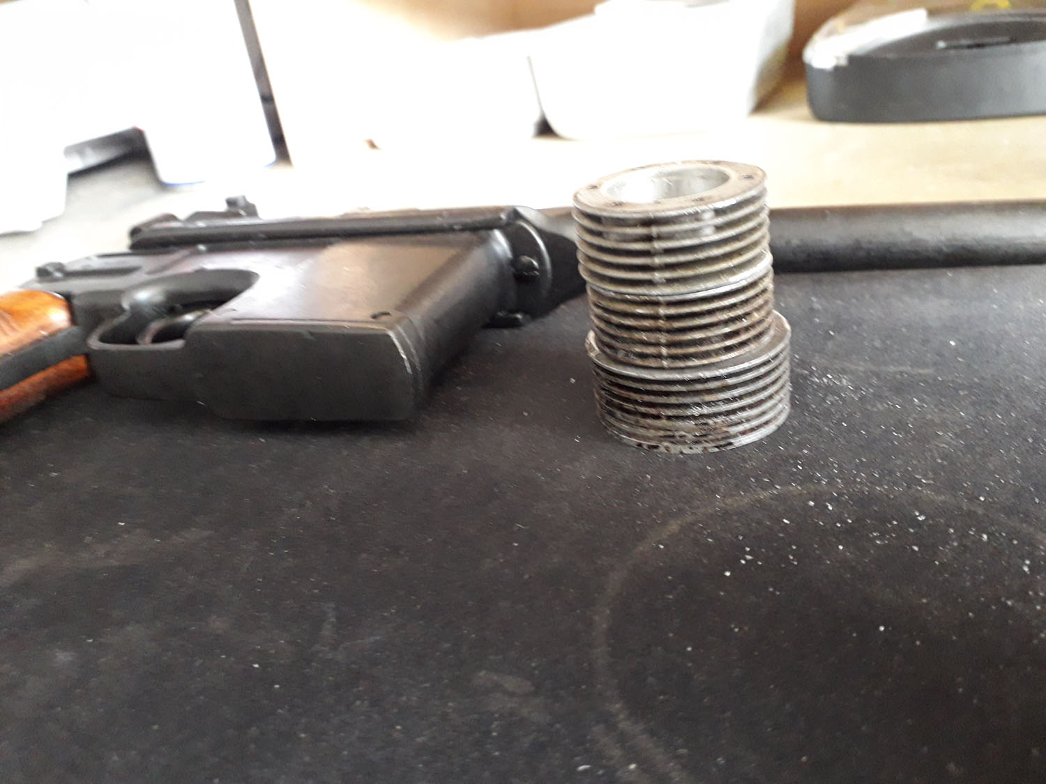 Je percerais mon cache flamme de ses petits évents prochainement. Je n'ai pas repeins l'ensemble du pistolet mais j'ai traité chaque piece individuellement (peinture et vieillissement avec ponçage ou utilisation de vinaigre pour oxyder ou de brou de noix pour encrasser les ailettes par exemple). Voila pour l'aventure...