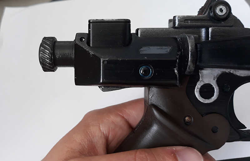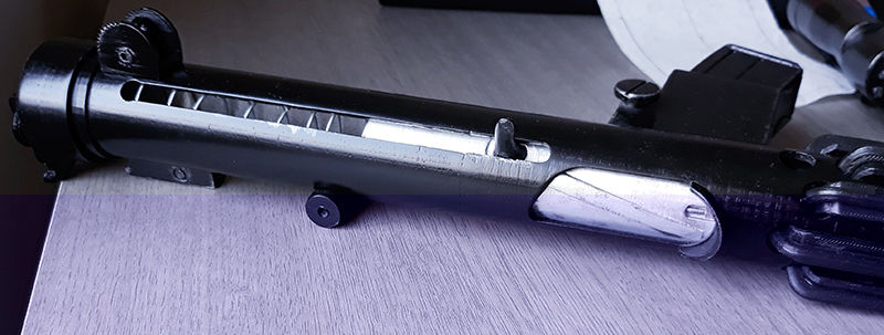 Assemblage du verrou et du ressort au restant du blaster. A noté que celui si est fonctionnel, ça ne sert à rien mais c'est toujours marrant !