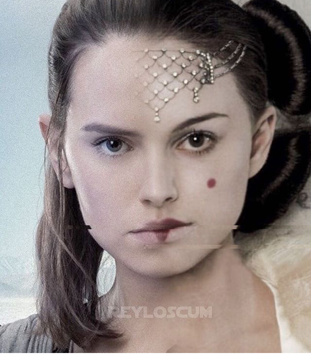 - elle est aussi discrètement féminisée par l'équipe de maquillage (les yeux subtilement maquillés et blush sur les pommettes), elle passe de l'enfant (look assez assexué au début de TFA) à la femme (à la fin de TLJ)