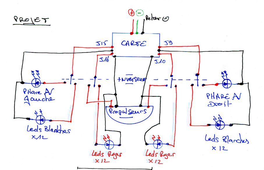 Non, L'inverseur doit être placé APRES la sortie. Je m'explique :Obi-Wan62 a écrit :Malheureusement, je suis quasi certain que ce procédé ne fonctionnera pas sur la carte Altaya. En effet, lors de la mise sous tension, c'est l'impulsion sur le bouton de la carte ou de la télécommande qui déclenche le passage du courant dans les branches. C'est à dire que tu auras bien les lumières qui restent éteintes sous la coque avec ton inverseur lorsque tu allumeras les propulseurs avec la touche B mais elles ne s'allumeront pas lorsque tu couperas ces propulseurs, la tension dans la branche retombant à 0.