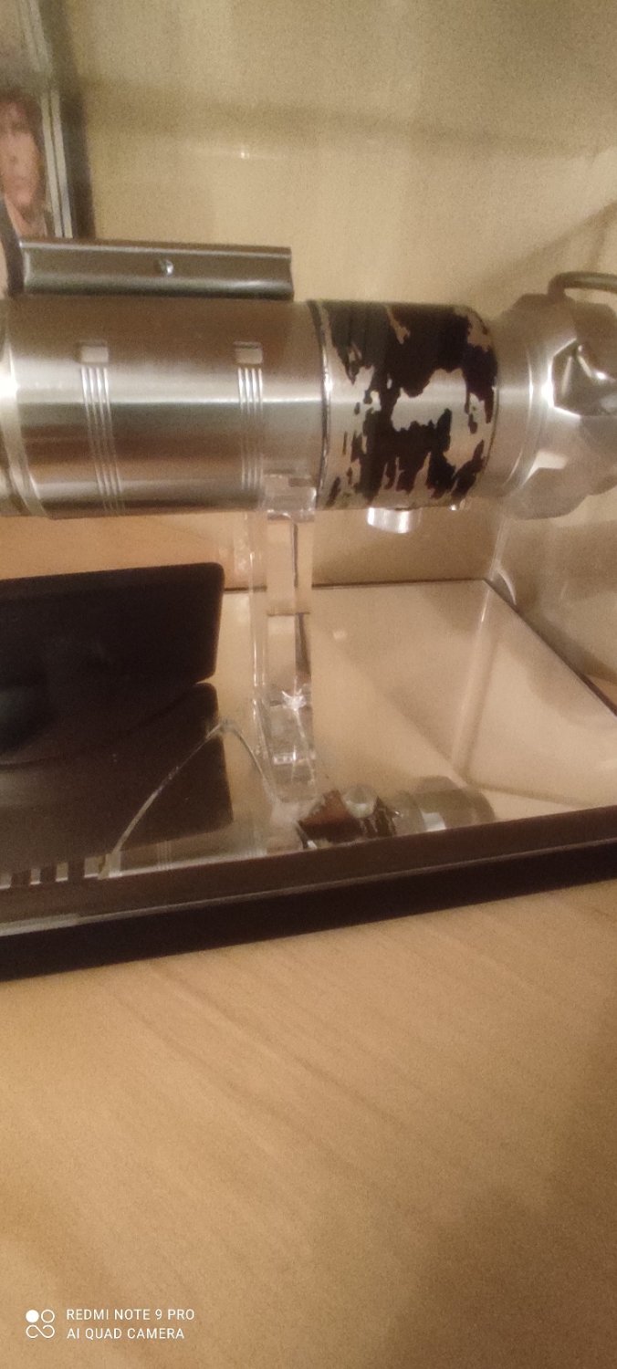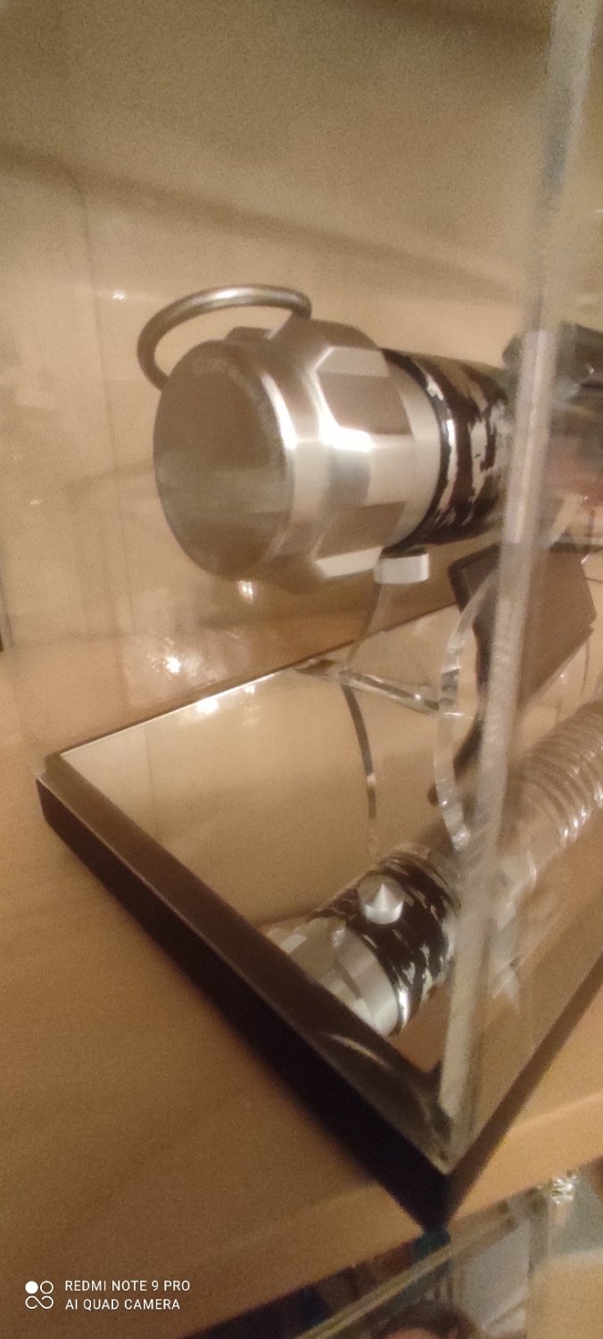 Point important, je ne dispose pas de tout ce qui est emballage. Je n'ai que les pièces exposées : sabre, plaque , stand et la vitrine en acrylique. Comble de malchance, le miroir de la base/stand est fêlée, et la vitrine a également un éclat.
