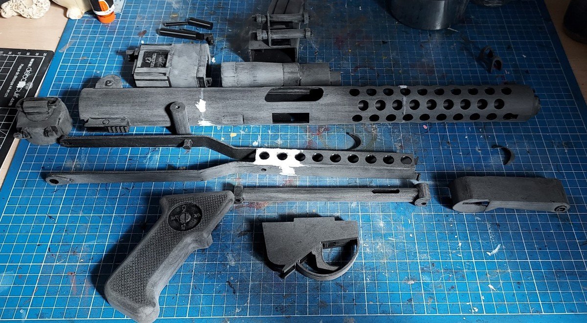 Et voilà, il est fini d'imprimer, et quasiment de poncer ! Un peu moins de 20h d'impression pour le tout. Je suis content j'ai testé le dépliage de la crosse, et ca fonctionne.... il me faut juste un ressort un peu plus puissant que celui d'un stylo, car c'est pas ouf
