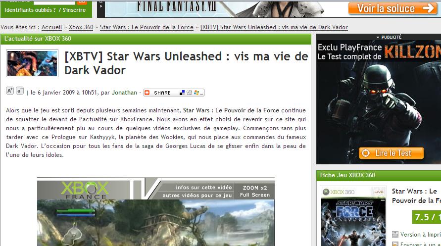 J'y ai enfin joué sur PS3 (et sûrement que ce week end aussi --youpi--) moi je trouve que c'est un très beau jeu... J'ai un peu de mal à me rendre compte qu'on joue le méchant dans ce jeu (mdr)... c'était bien plus visible avec KOTOR où dès qu'on choisissait mal on gagnait des points du côté obscur (en plus du fait que menacer ou tuer un personnage était déjà de la méchanceté)... TFU je le vois comme un jeu de guerre, en ce sens qu'on nous envoi en mission combattre des "ennemis" et j'oublie un peu qu'ils sont des Jedi et donc des gentils, pour moi ceux sont des ennemis... de même si j'étais Jedi dans le jeu, je n'aurais pas l'impression de combattre des Sith mais bien des ennemis...Uttini a écrit :Moi j'ai joué à TFU sur DS, ben ça ne plait pas de jouer les méchants.