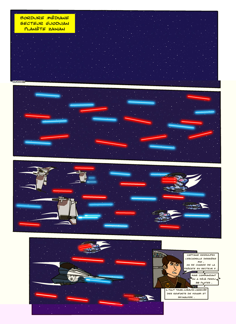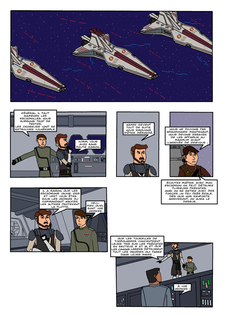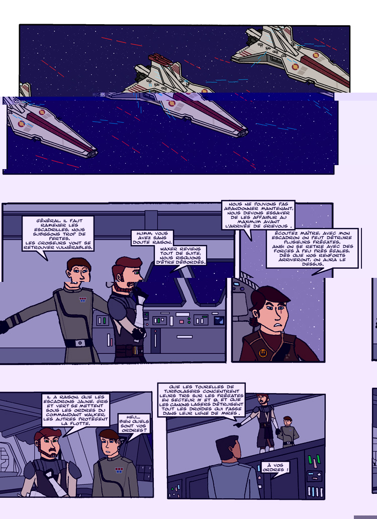 Mais autrement la planche est pas mal du tout. Donne un peu plus de choses à faire au Maître de Wax. Parce que là, j'ai l'impression qu'il fait plus dans la figuration qu'autre chose et que c'est lui qui observe plus que n'apprend des choses à son jeune Padawan en matière de stratégie. Rappelle-toi des leçons données par Qui-gon et Obi-wan à leurs padawans respectifs dans les films.