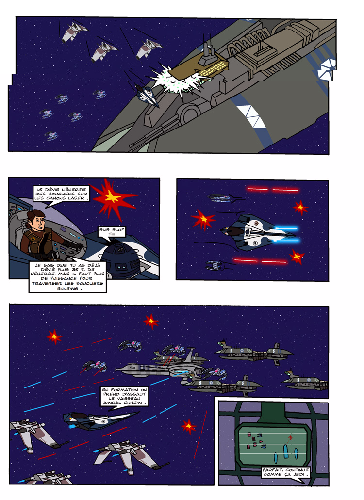 J'aime bien le mélange entre des vues en perspective et d'autres, comme la case 3, où on se retrouve de face : la composition de cette case, avec les lasers bien parallèles, le chasseur et les explosions, évoque un peu la vue des vieux jeux vidéo de shoot spatial ! Très sympa !