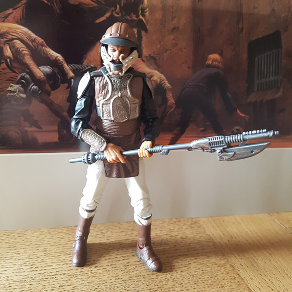 Je ne résiste pas a l'envie de vous montrer ma dernière acquisition, la figurine de Lando Skiff Guard dans la gamme the black serie archive, c'est un repaint de la version de 2018...le Head sculpt est juste sublime