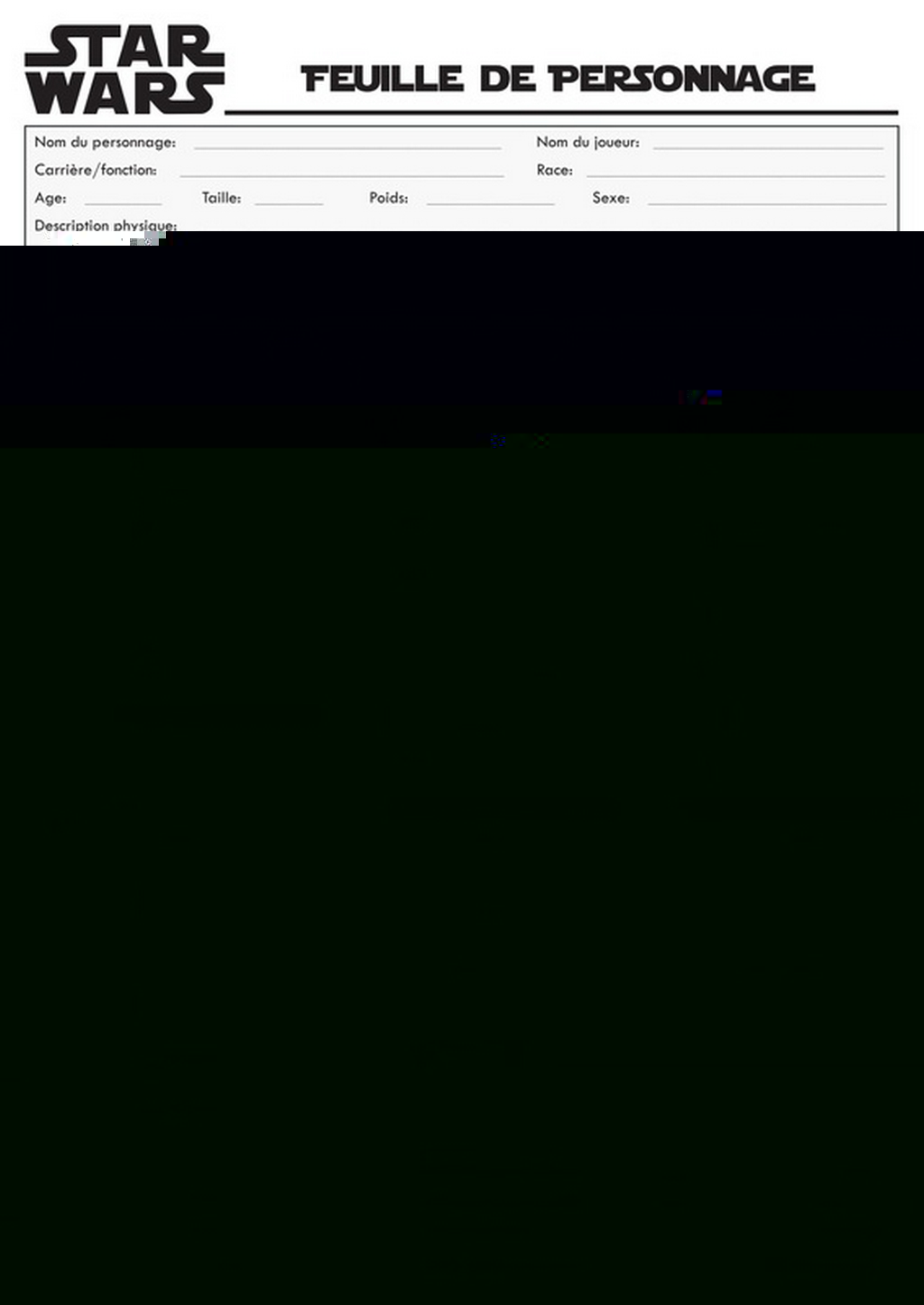 Faut juste nous dire combien de points on peut mettre dans chaque catégorie, et si y'a des "points bonus" de base suivant l'espèce et classe des persos (style wookiee +10 en résistance et -50 en discrétion